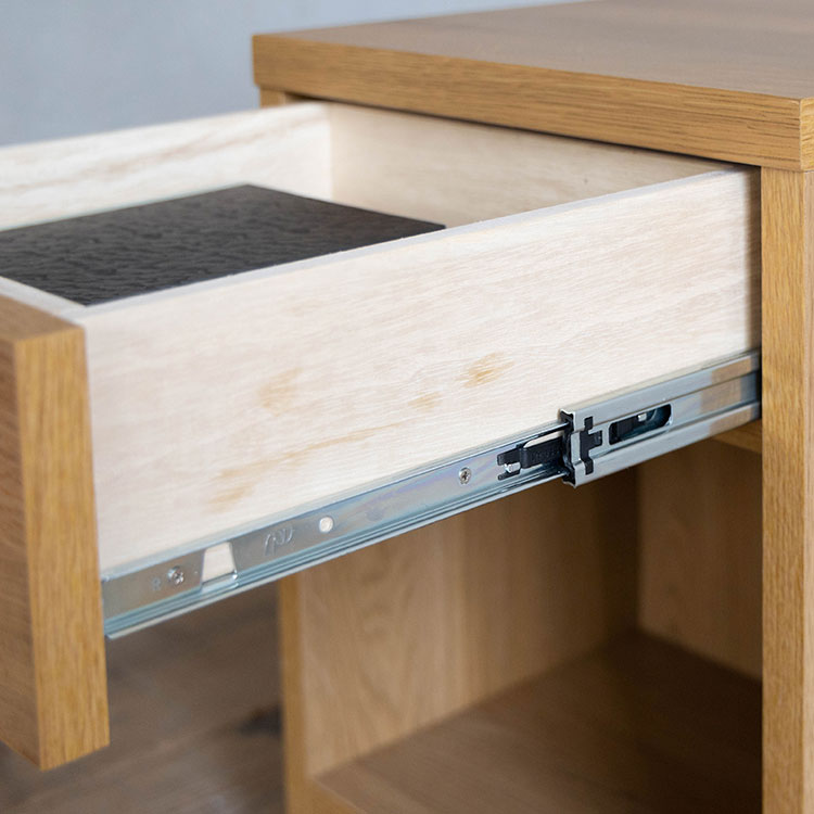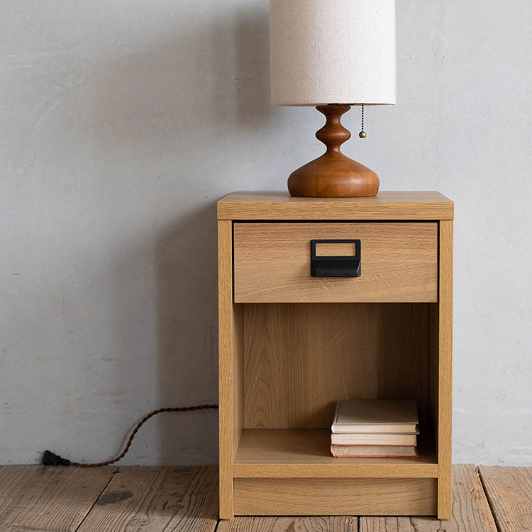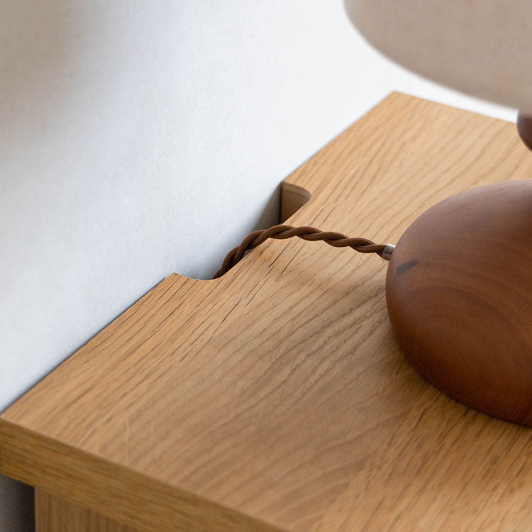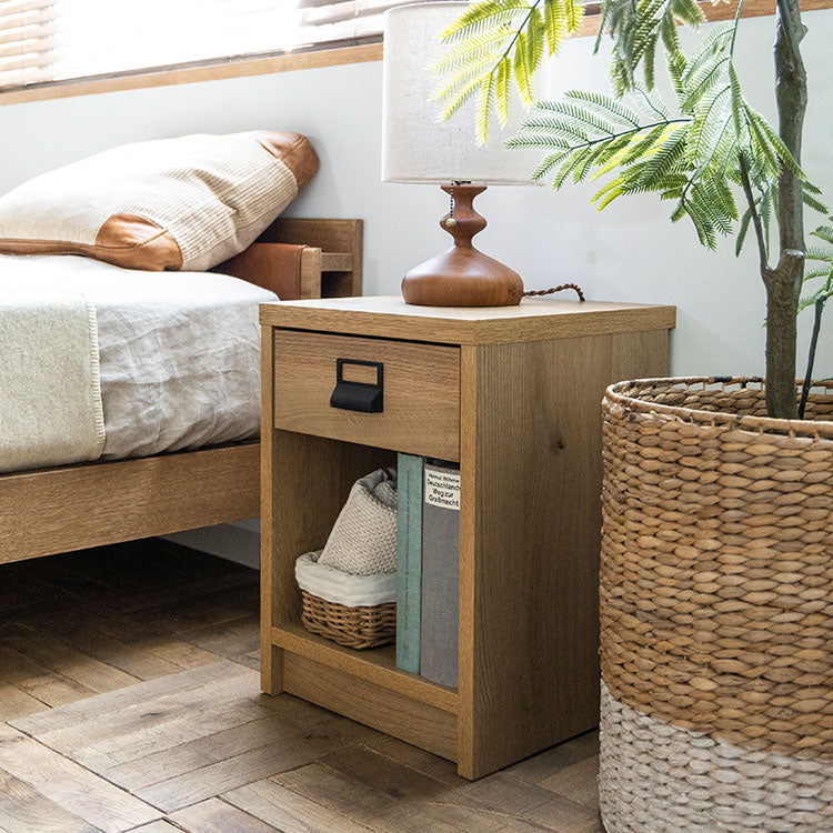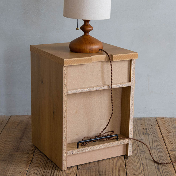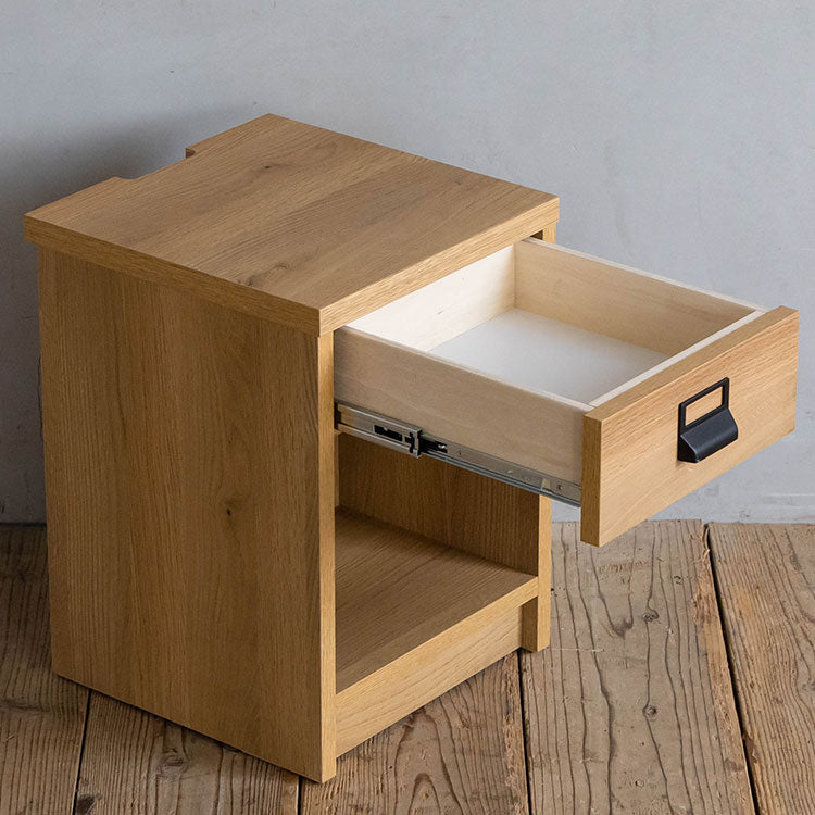 商品情報 オークを基調としたナチュラルな木の風合いを、黒のスチールパーツで引き締めたスタイリッシュさと温かみの感じられるシンプルなナイトチェストです。背面のコード捌きにもこだわり、周辺配線をすっきりみせることができます。