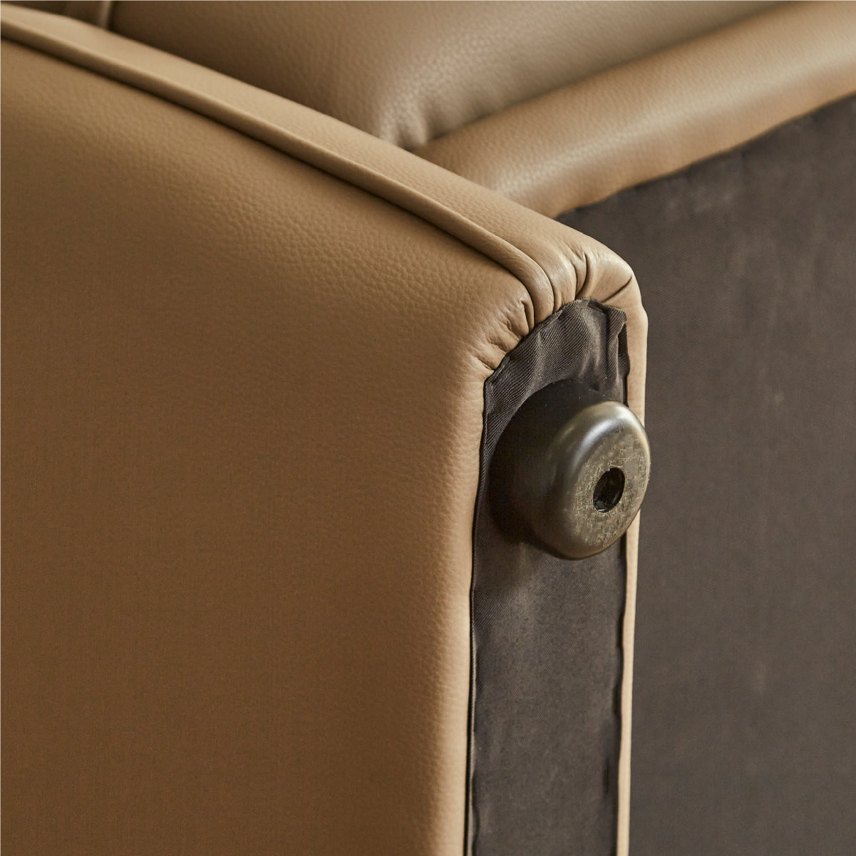 ソファの中央についている脚は、人が座った時に床に接地する構造で、 あくまで荷重がかかった時の補強用のものでございますので、浮いている状態が正常になります。