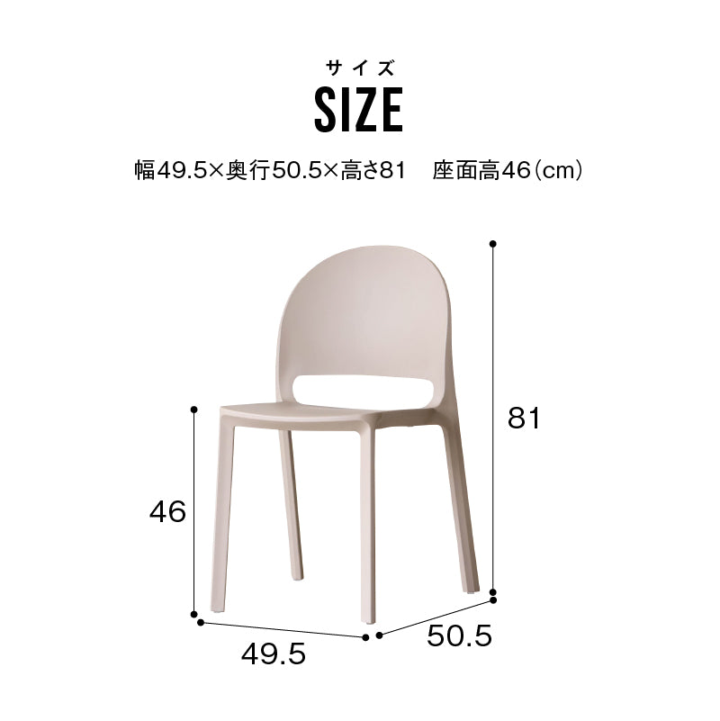 商品情報 柔らかい印象の曲線的なフォルムで、スタイリッシュなデザインが特徴のチェア。優しいカラーリングは、ナチュラルからモダンまで幅広いスタイルに調和します。耐水性のあるPP樹脂素材のため、屋外でもご使用いただけます。表面は汚れても軽く拭くだけで、 お手入れが簡単です。 使わない時は、複数あっても場所を取らないスタッキング仕様です。
