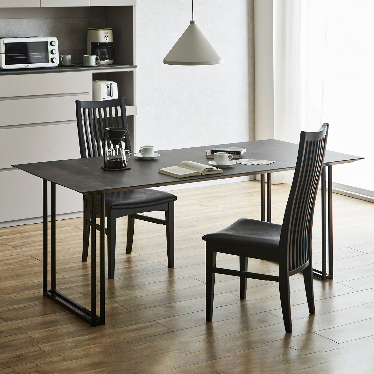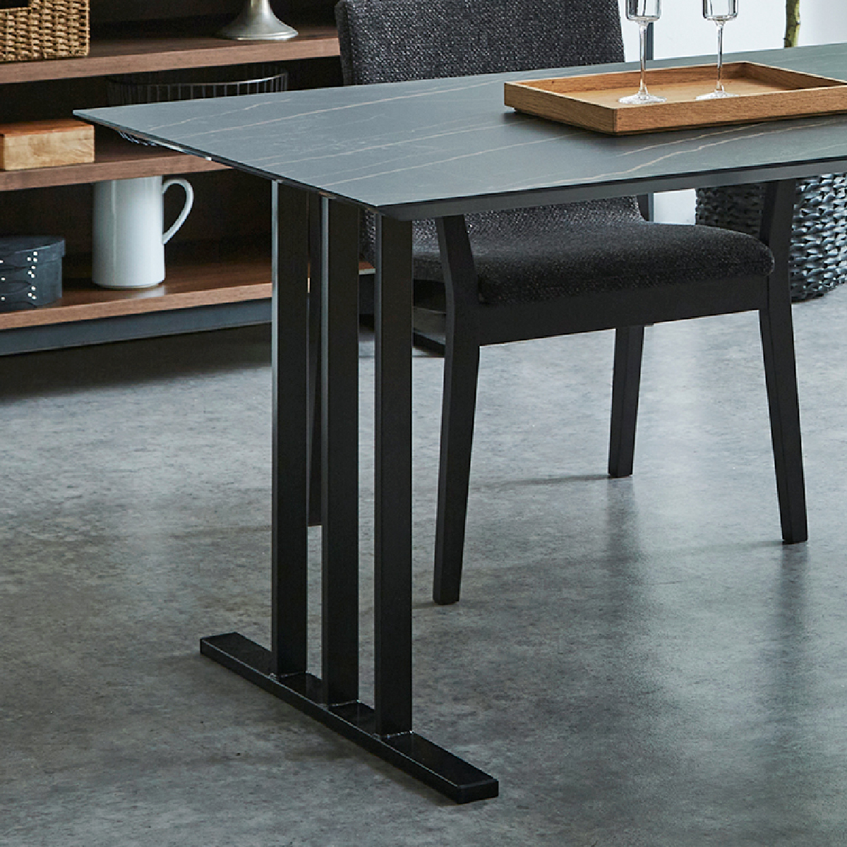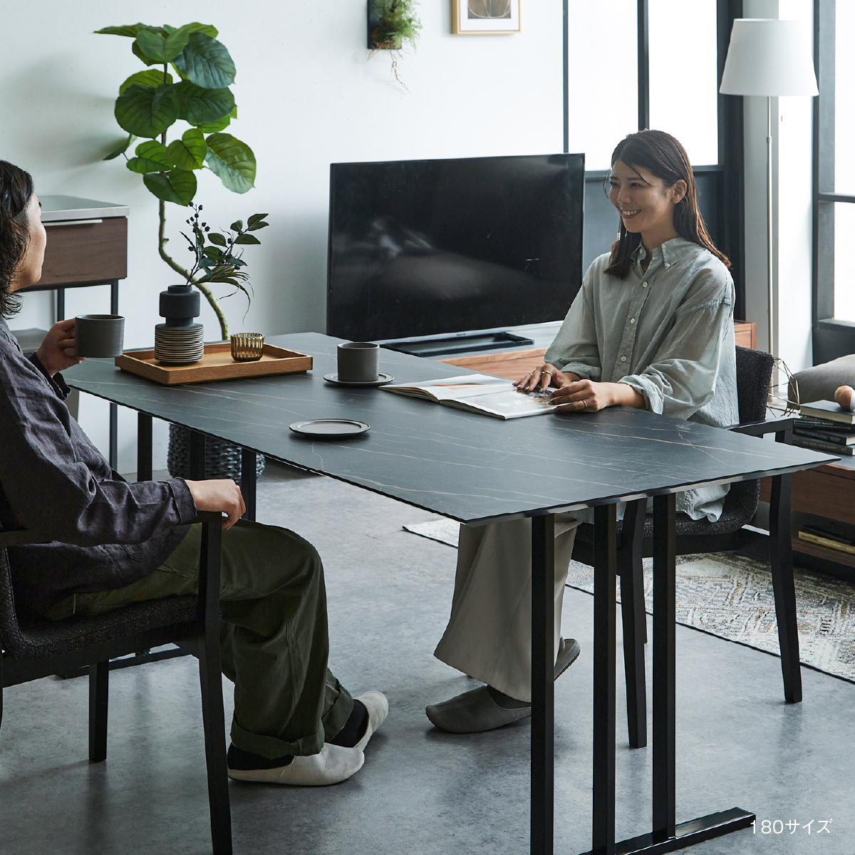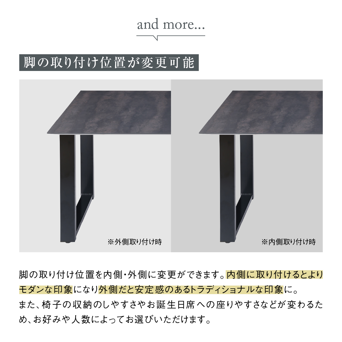 脚には天板のデザインを引き立たせるステンレス素材を採用。 150/180サイズは脚のデザインを4種類からお選びいただけます。