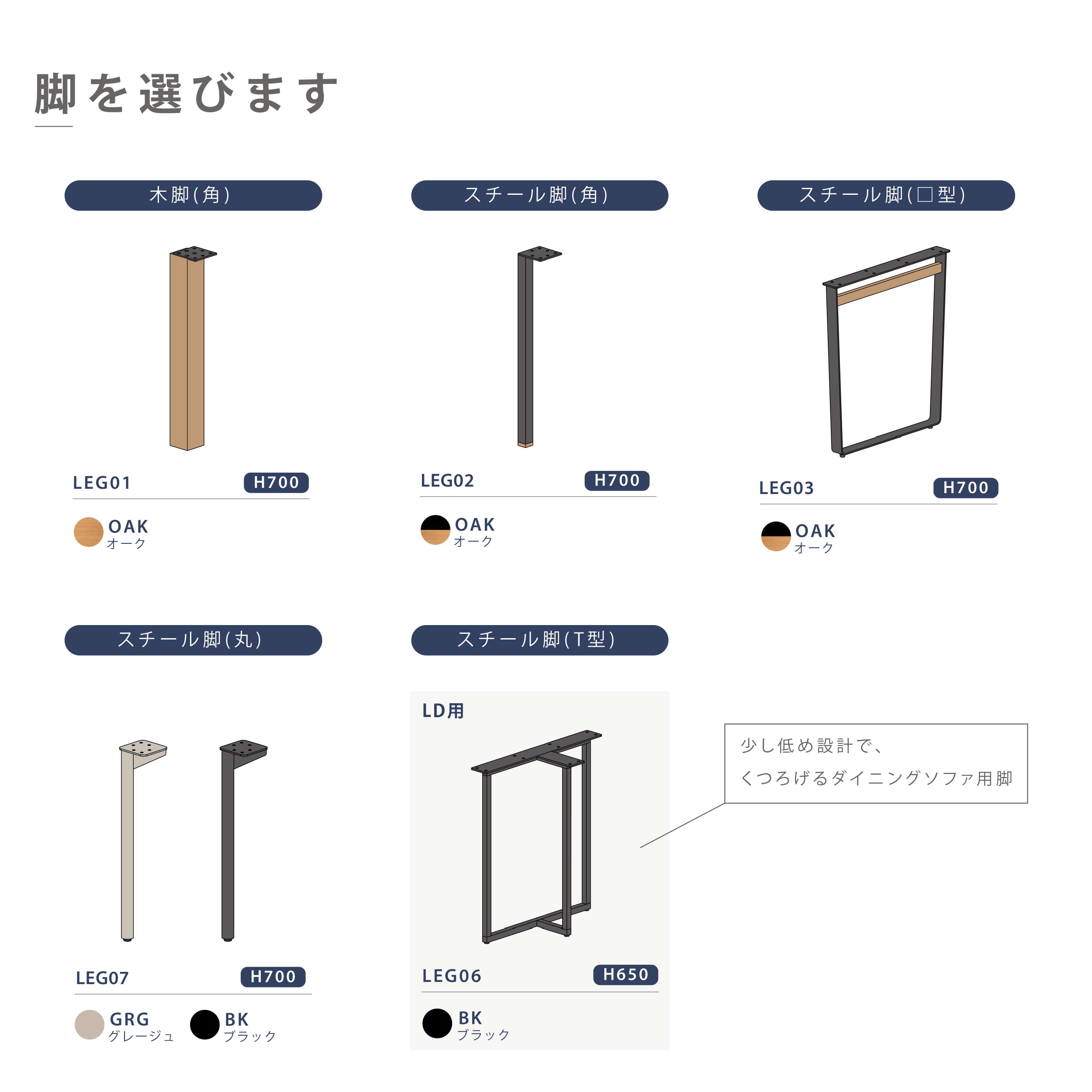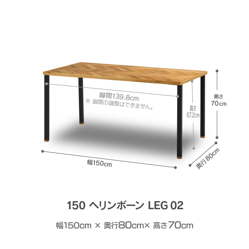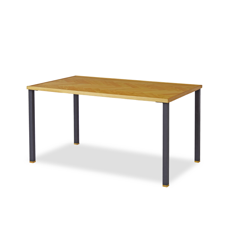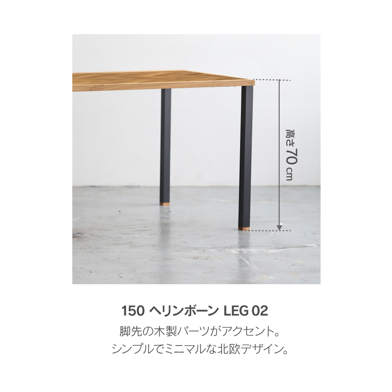 商品情報 天板と脚が選べるセミオーダーのダイニングテーブル。 天板は8サイズ、脚は6つのバリエーションから自分好みのテーブルをセレクトできます。 [LEG 02] マットなブラックカラーの四角い金属脚です。 ヘリンボーン天板はオーク材の突板を貼りあわせ、ランダムで趣のある表情に仕上げています。四方を囲い内側に面取りを施した無垢材の枠にも家具のしつらえが感じられます。